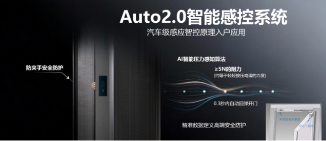 此次发布的九皇智联生态入户门系列,集智能安防、生态联动、人性化设计于一体,搭载行业领先的Auto2.0智能感控系统,让入户门实现汽车级感应开关智控。其中YU1 Max性能版更具备防夹手安全防护,当检测到≥5N的阻力时,0.3秒内自动回弹开门。